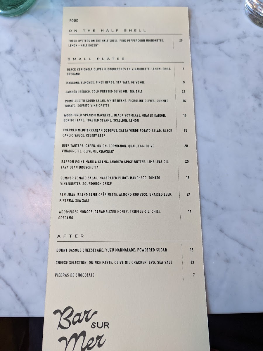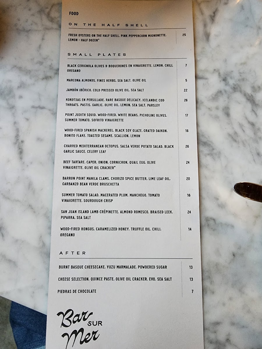 Welcome to Bar Sur Mer, a culinary gem nestled in Seattle. This exquisite restaurant specializes in an array of small plates and vibrant cocktails, creating an atmosphere that is both stylish and inviting. The menu is a feast for the senses, showcasing an impressive selection of fresh seafood, including their renowned half-dozen oysters that are elegantly presented on black stones.